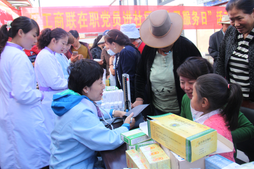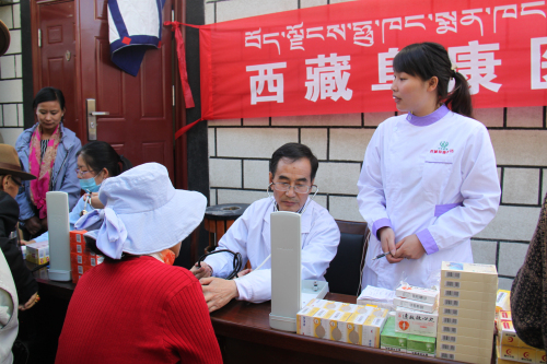 根据自治区工商联《关于深化区直机关在职党员到社区服务群众活动》的统一安排:阜康医药有限公司四个党支部,在张德才总院长的带领下,一行8人在2015年8月8日上午到拉萨市城关区嘎玛贡桑社区进行义诊活动,带着1.5万余元药品和便携式B超,心电图等。在半天时间内贡义诊380余人,为社区群众进行了测量血压、发放药品、健康咨询等,受到了社区群众的热烈欢迎。期间正在慰问群众的自治区政协副主席阿沛晋源,和区统战部副部长、区工商联党组副书记李瑞富等领导的高度评价。
