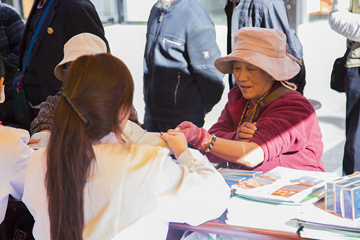 自14日早上九点活动开始,前来阜康医药义诊宣传点测血压、测血糖、咨询身体健康问题及安全用药知识的人便络绎不绝,整整一上午,阜康医药16名医护人员都在一刻不停的忙前忙后,但能够为广大藏族同胞及社会群众服务,大家都丝毫不觉得辛苦,反而发自内心的感到充实与喜悦。据活动结束后统计,本次活动西藏阜康医药发展有限公司免费发放各类相关资料千余份,免费发放维生素、钙片、风湿及心脑类等药品一万两千余元,免费测血压、血糖、看病等也多达数百人次。