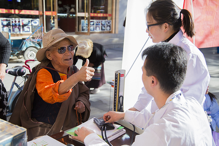 在活动期间,前来阜康医药义诊宣传点的藏族同胞及社会群众纷纷表达了自己对阜康医药全体员工的感谢,一位年龄较大的藏族老伯前来测量完血压并咨询了一些自己身体健康方面的问题之后,更是再三对阜康医药的医护人员表达了谢意,并且毫不吝啬赞美之情地对我们竖起了大拇指!西藏自治区德吉副主席等几位领导在本次活动巡查工作中,于阜康医药免费义诊宣传点与我院医护人员等进行了交流,并再次表达了对阜康医药长期以来积极参与各项活动、倾情奉献社会民族、热心回馈西藏百姓的诚挚的感谢。