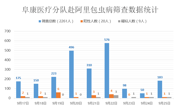 由于居民分散,9月24日阜康医疗队驱车奔波一天,共筛查50人,发现1例阳性,1例疑似。9月25日,筛查183人,发现1例阳性,1例疑似!但是,每一次的检查总有个别人拒绝抽血,我们的心情难以用语言表达,不知道他们出于什么原因拒绝,我们心里还是担忧他们的健康状况,深深地感到健康卫生知识教育仍需加强,包虫病防治工作任重道远,我们将砥砺前行!