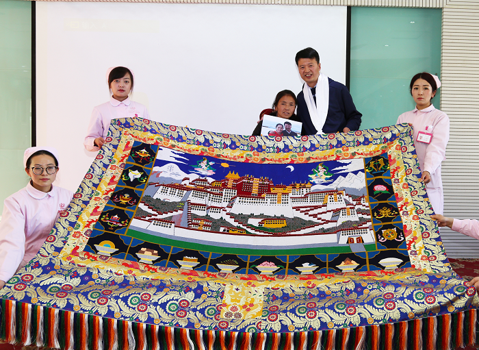 梅朵在出生后不久就被查出患有食道闭锁、肛门畸形,在阜康全额资助下赴成都手术。手术后,梅朵的身体还是不太好,近两年经常住院,阜康医院又为她减免全部的医疗费用,为了表达对阜康的感激之情,梅朵妈妈用3年时间,编织了一幅布达拉宫唐卡,在活动现场送给了王斌书记。