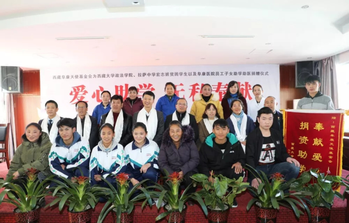 本次捐赠仪式,西藏阜康天使基金会为西藏大学政法学院30名贫困学生,每人每年捐助4000元的生活补贴,总金额为120000元人民币;为拉萨中学宏志班10名学生,每人每年6000元的生活补贴,总金额60000元人民币;为阜康医院内部6名贫困员工的子女(4名助学;2名助医)给予助学助医补助,每人每年6000元,总金额36000元人民币。为社会学生2名(1名高中生、1名大学生);每人6000元,共计12000元人民币。此次捐赠总金额为228000元人民币。此外阜康医院还分别为西藏大学政法学院20名和拉萨中学20名身体存在健康隐患的学生开通绿色体检通道。