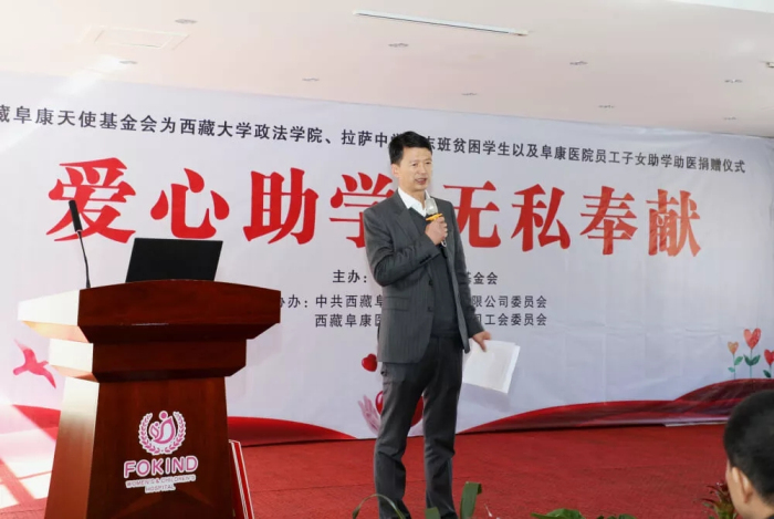 拉萨中学校长陈飞,向西藏阜康天使基金会表示了衷心的感谢。他表示:阜康是西藏民营医疗行业的典范,王斌董事长在发展事业的同时,从未忘记回馈社会,成立阜康天使基金会,慷慨解囊,帮助西藏教育事业的发展,切实体现了“仁心仁术,止于至善”的阜康企业文化精神。
