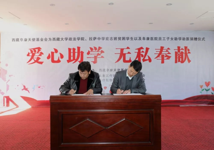 西藏阜康天使基金会理事长、西藏阜康医疗股份有限公司党委书记、董事长王斌与西藏大学政法学院党委书记罗布签订捐助协议
