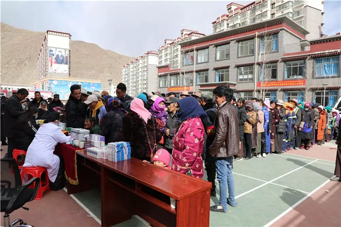 3月5日,西藏阜康医疗股份有限公司党委志愿义诊组来到拉萨市经开区德吉康萨社区,为一千多名农牧区搬迁群众进行义诊,并捐赠了价值一万多元的药品。