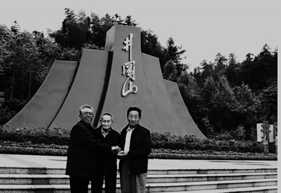 三位老人在井冈山前握手留影