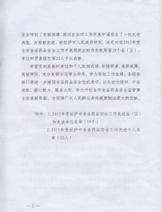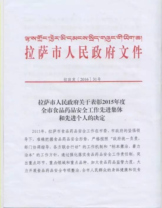 本次会议还就2015年度在全市食品药品安全工作中表现突出的市农牧局等19个县(区)、单位给予了表彰。西藏阜康医药发展有限公司也因在2015年食品药品监督管理工作中表现突出荣获表彰并获得“2015年全市食品药品安全工作先进集体”荣誉称号。刘潇潇总经理代表阜康医药发展有限公司接受了本次表彰。她表示阜康医药发展有限公司能够获得本次表彰是整个阜康的骄傲,在今后的工作中我们一定会珍惜荣誉,再接再厉,充分发挥示范带头作用,努力再创工作佳绩,为西藏食品药品安全作出自己的贡献。