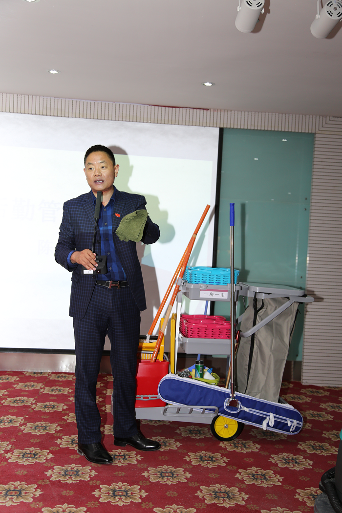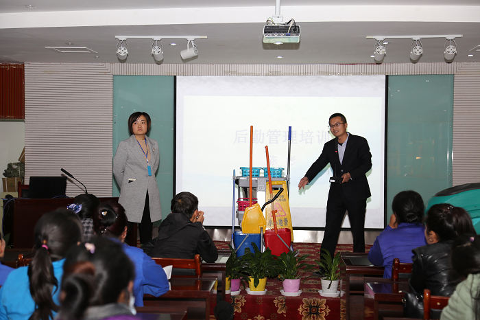 培训最后环节,由后勤保障部对所有参会的保洁人员进行现场演示,再次对保洁工具车的配置和扫地机的使用方法进行了详细的讲解,确保每位保洁人员都会熟练使用,达到卫生标准。