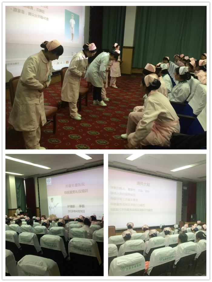 【概要】:2018年4月9日,西藏阜康医院、西藏阜康医院妇产儿童分院、西藏阜康医院心脑血管分院三家医院护理部组织开展了导医服务礼仪培训,培训由护理部主任李丽主讲并进行了现场指导与考核,旨在规范服务礼仪,提高服务质量。