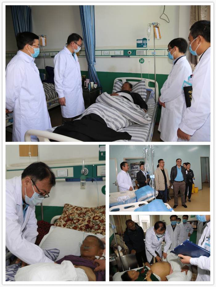 在阜康医院住院部,周平红教授一行换上工作服和阜康医院消化内科医护人员一起查房。在44号尼珍的病床前,周平红教授详细询问病人的生理、病理指标,阜康医院医护人员一一详细回答。之后,周平红教授走到病床前对患者的体征状况进行了仔细检查,并向家属询问病人的实时病况。周平红教授还来到89岁的患者扎西、离退休人员格桑的病床前,询问了病人的各项指标并仔细进行了体征检查。