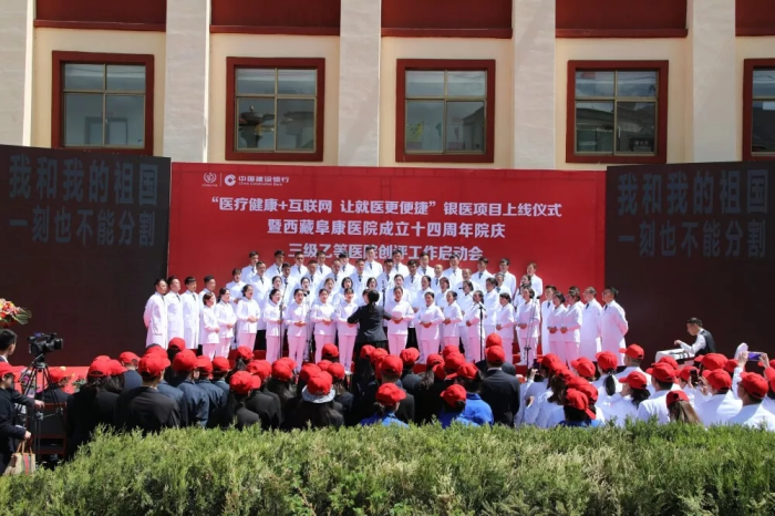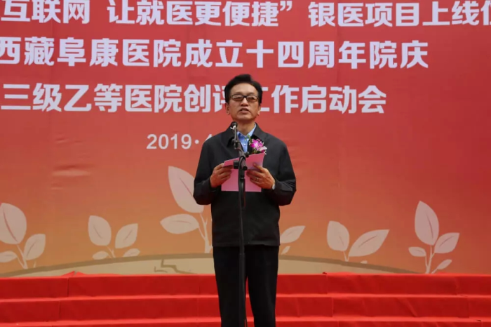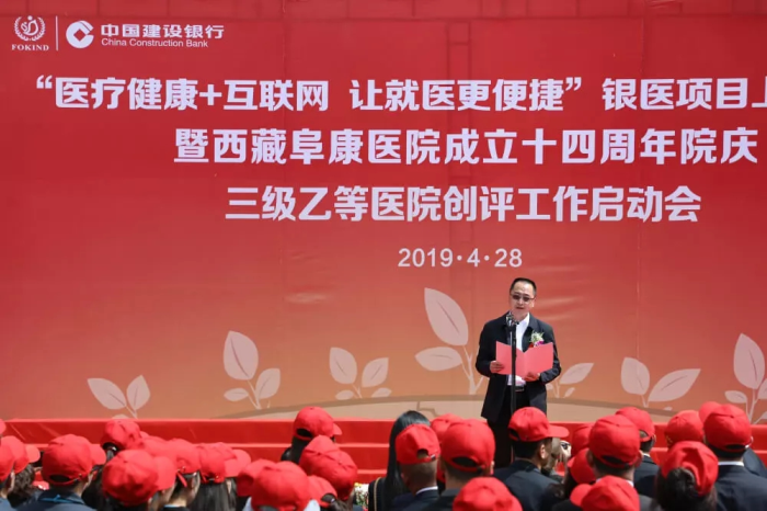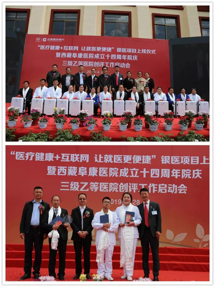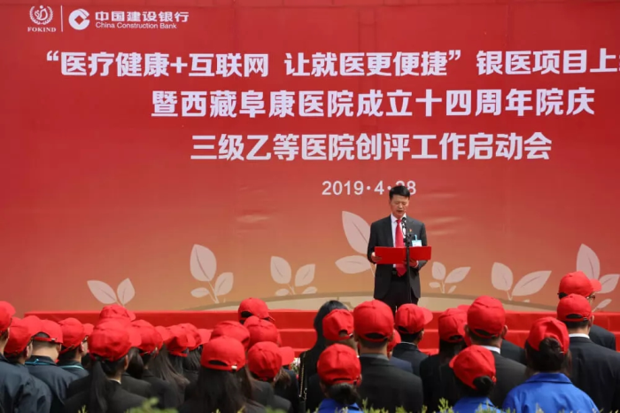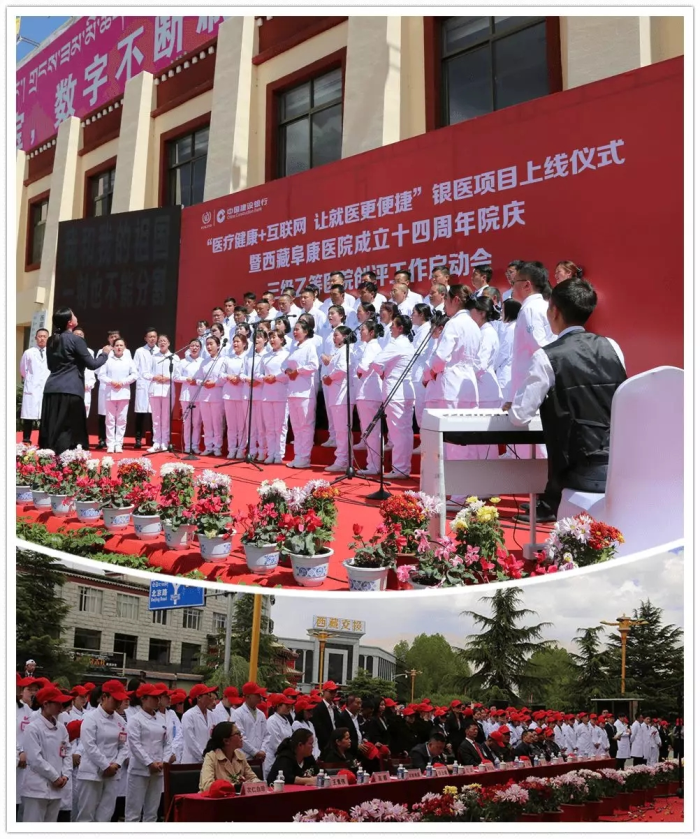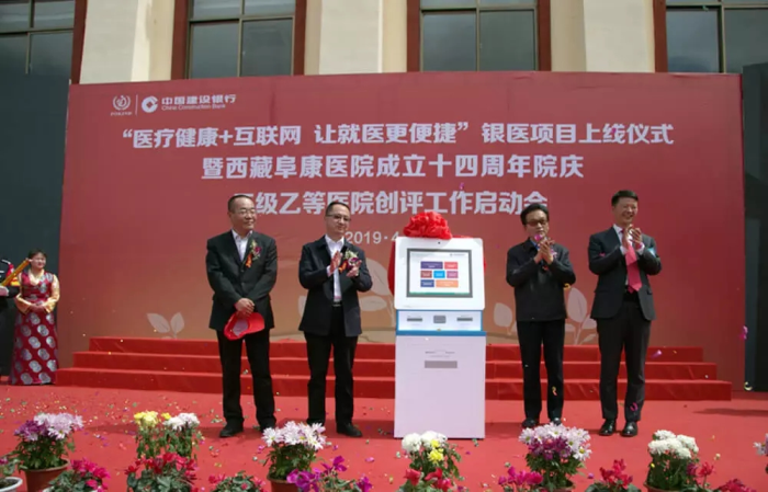 春日的圣城拉萨阳光明媚,生机盎然。2019年4月28日,注定是一个不平凡的日子!下午15时,来自自治区政府部门、各大金融机构、科技教育单位的12位嘉宾和阜康医院的广大医务人员汇聚一堂,共同见证建设银行西藏分行、西藏阜康医院“医疗健康+互联网,让就医更健康”银医项目上线暨阜康医院成立十四周年院庆三级乙等医院创评工作正式启动,标志着在雪域高原上成功走过十四年光辉历程的阜康医院,正在一个全新的起点上承载着“健康西藏”的光荣使命再次扬帆远航、整装出发!