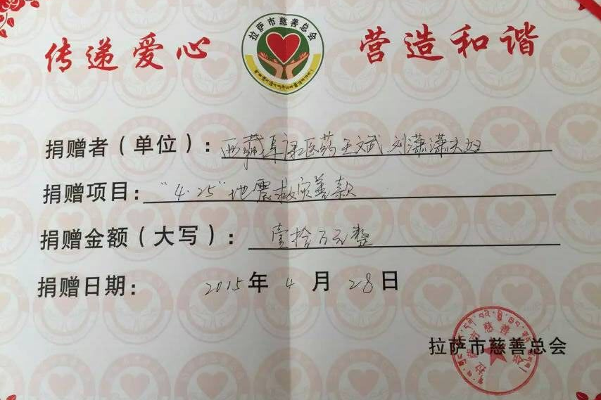 在西藏,哪家有灾哪家有难,在王斌董事长知情的情况下,都会伸出援助之手,这次尼泊尔地震,除了医院募捐的现金205682元外,王总私人还拿出了十万元捐赠给灾区,希望自己的绵薄之力能助灾区人民早日走出阴霾。