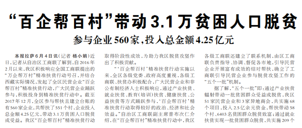 本报拉萨6月4日讯(记者 杨小娟)近日,记者从自治区工商联了解到,自2016年2月以来,我区积极响应全国工商联提出的“万企帮万村”精准扶贫行动号召,并结合西藏实际情况,发起了全区民营企业“百企帮百村”精准扶贫行动,广大民营企业踊跃参与,积极投身到精准扶贫行动中。截至2017年12月,全区参与帮扶且建立台账的有560家企业,共帮扶了551个村,企业投入总金额4.25亿元,带动3.1万贫困人口脱贫或受益。我区“百企帮百村”精准扶贫行动取得阶段性成效,为助力我区脱贫攻坚作出了积极贡献。
