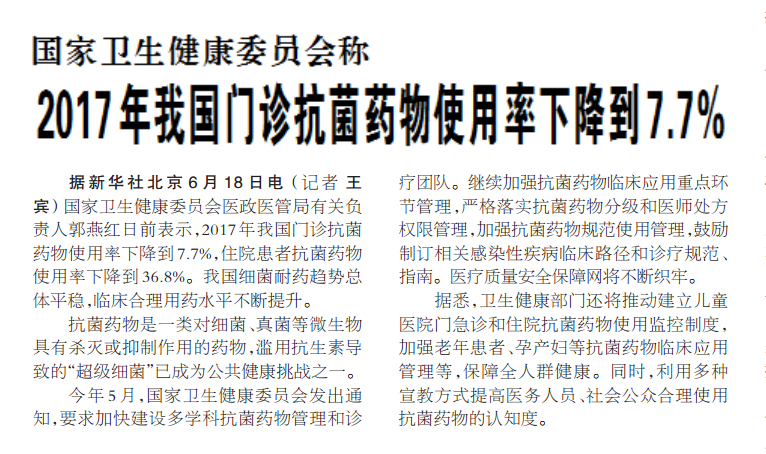 据新华社北京6月18日电 (记者 王宾) 国家卫生健康委员会医政医管局有关负责人郭燕红日前表示,2017年我国门诊抗菌药物使用率下降到7.7%,住院患者抗菌药物使用率下降到36.8%。我国细菌耐药趋势总体平稳,临床合理用药水平不断提升。