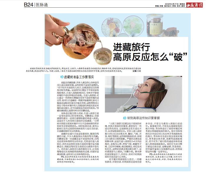说起去西藏旅游,许多人都会担心身体是否可以适应高原环境,这些担忧不是没有道理。“对于初次来高原的人而言,出现高原反应的情况较为普遍。这是因为长期处于平原或是低海拔地区,在进入高海拔地区后,身体对于缺氧环境的不适应所作出的表现。在进入高原前,可以通过一些药物来增强自身对于高原环境的适应性,如可以在进藏前一周就开始服用红景天口服液或是购买红景天片泡水饮用,这种药物可以使处于特殊环境中的人员提高机体抵抗恶劣环境的适应能力,对于抗缺氧也有很好的效果。”西藏阜康医院心血管内科主任田鹏说道。