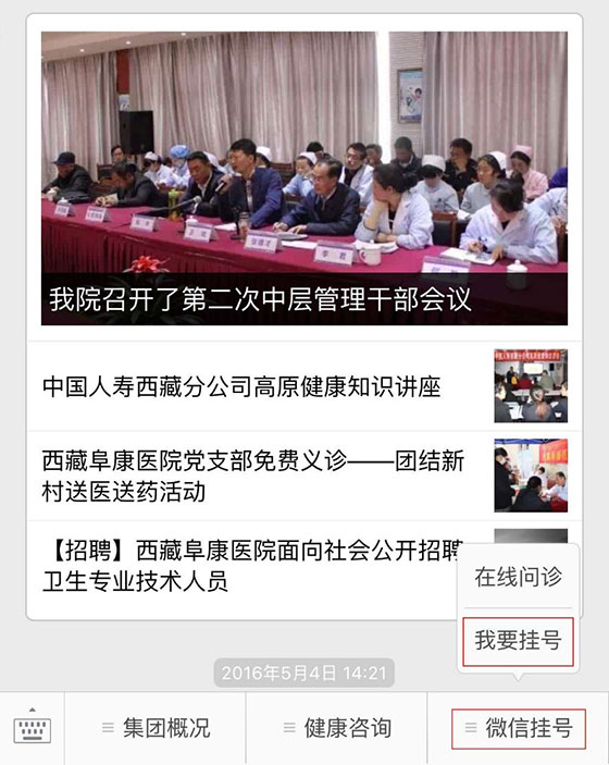 西藏阜康医院微信公众平台网上预约挂号系统现已正式上线,可提供微信挂号、在线问诊、健康咨询、新闻动态等服务,我们通过信息的推送,增加与新老朋友的互动。
