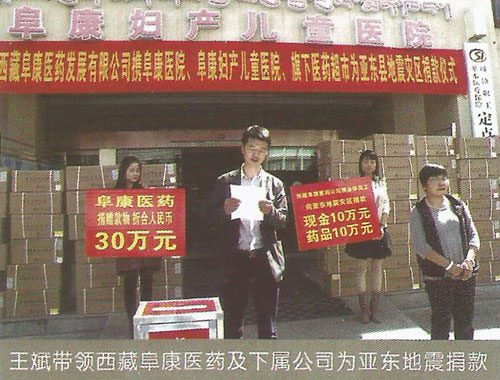 到了2000年,注册成立了西藏阜康医药发展有限公司,下设阜康医院、阜康大药房和拉萨大药房等8个分公司。从最初的一间药房起,到创办西藏阜康医院。做为一名从医者王斌说:“医者父母心”,医生要有一颗仁慈的心善待患者,应视病人为亲人、为自己的父母姐妹。在王斌的带领下阜康医院在注重两个效益的同时,时刻不忘回报社会在制定医疗收费标准方面参照拉萨市医疗收费标准的基础上再下调20%,对药品定价按照物价部门规定的价格水平下调15%,是目前拉萨市医疗收费标准最低的,同时还取消了门诊、急诊等一系列费用。对经济困难的病员实行减少或免费治疗,到至今在阜康医院从没出现过因病人无钱付医疗费而得不到治疗的现象。并在医院员工制度上推出七条禁令“严禁见死不救、严禁推诿病人、严禁收受病人红包、严禁私扣病人药品”等各种制度保障病人利益不受侵犯。从2005年4月28日开业始,几年来阜康医院对经济有困难的门诊、急诊病人实行减免医疗费用人数达560多人次,“惠民病房”优惠幅度达50%,减免优惠金额达64余万元,同时还采取各种形式送医、送药下乡,到孤儿院、养老院、残疾人学校等免费送医、送药、资助等。