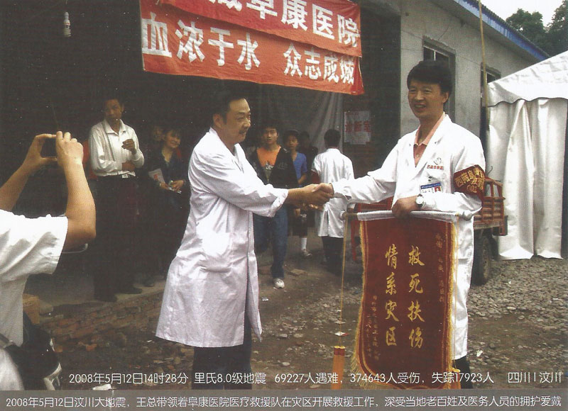 阜康医疗救援队在王斌的带领下以地震灾区绵阳绵竹九龙镇为驻点,负责九龙、遵道、金化、汉旺等灾民的医疗救治工作。截止2008年6月17日共救治病人6339人,其中还包括抗震抢险的21名武警消防官兵。医疗队高效率、高质量的救援工作当地老百姓看眼里,感激在心里,用不同的方式对医疗队表达了感激之情。当地中共绵竹市委、绵竹市人民政府、绵竹市抗震救灾指挥部授予阜康医疗队“5.12大地震抗震救灾先进集体”。被中华全国总工会授予“‘抗震救灾,重建家园’工人先锋号”。