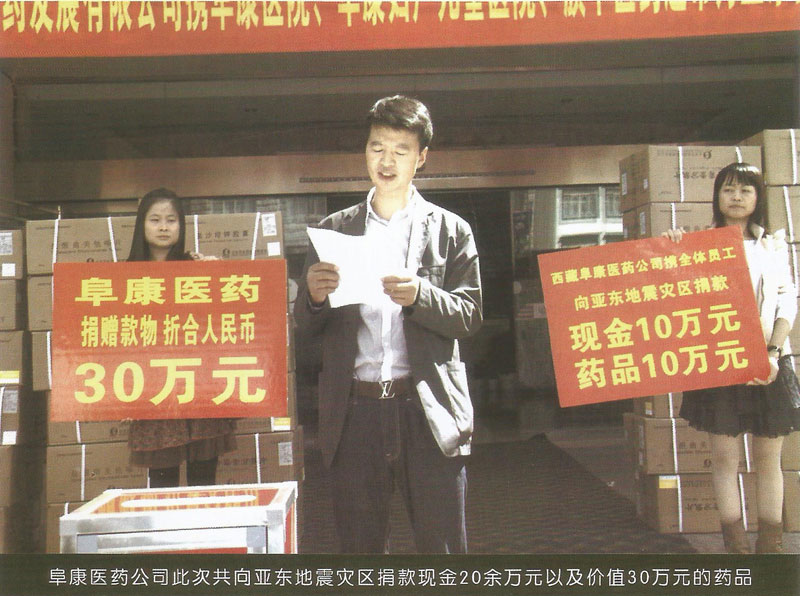 2011年9月8日,印度锡金发生了6.8级地震,地震造成了亚东县供水、供电、交通、通信等度全部瘫痪。灾情牵动所有西藏人民的心,更牵动着阜康人的心。25日,为了支援灾区,阜康医药发展有限公司携阜康医院、阜康妇产儿童医院以及旗下医药超市举行了为亚东地震灾区捐款仪式。在捐款现场,一箱箱捐助药品整齐地堆放在起,捐歉员工排着整齐的队伍有序的走到捐款箱边,把自己的捐款投入到箱中。