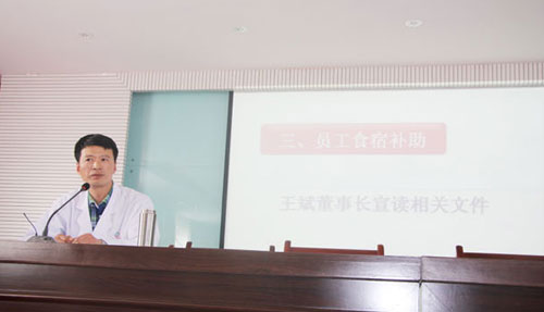在谈到员工食宿补助时,王斌董事长宣读了相关文件,并就一些问题做出了解释:员工的食堂补助由原来的四百元上涨到五百元;从六月份起,由三家医院拿出部分收入补贴员工住宿,如此住宿补贴由原来的一百四十元上涨到二百四十元。以此来提高全体员工的食宿质量,并以此来保证低收入者不为一日三餐所发愁,减轻低收入者们的生活压力。为此,王斌董事长还要求综合办公室下发文件,要求食堂提高饭菜质量,保证员工吃上品种多样且营养又卫生的饭菜。对此,张德才院长发表了自己的一些看法,也谈了关于食堂的一些改革,并对王斌董事长的这项决议表示了大力支持。