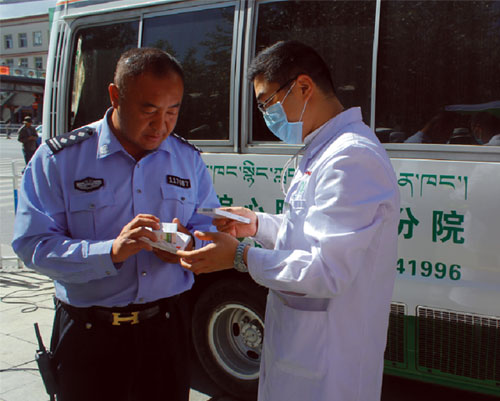 西藏阜康(国际)健康体检中心根据民警们的职业特点,量身定制了体检套餐。张德才院长介绍说:“为不耽误民警的工作时间,医院决定将体检车直接开到民警的便民执勤点,由专业医护人员为民警进行血压测量、心电图测量、B超等方面的检查。