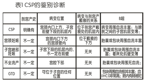 CSP患者全部都有明确的剖宫产史,胎囊着床在剖宫产瘢痕内,周围有丰富的血流,瘢痕处肌壁变薄。在临床工作中,CSP易与宫颈妊娠、子宫峡部妊娠、不全流产和滋养细胞疾病相混淆,需要仔细鉴别。一般通过病史、妊娠囊位置和B超检查鉴别必要时可行血清βHCG、肺CT和病理检查。
